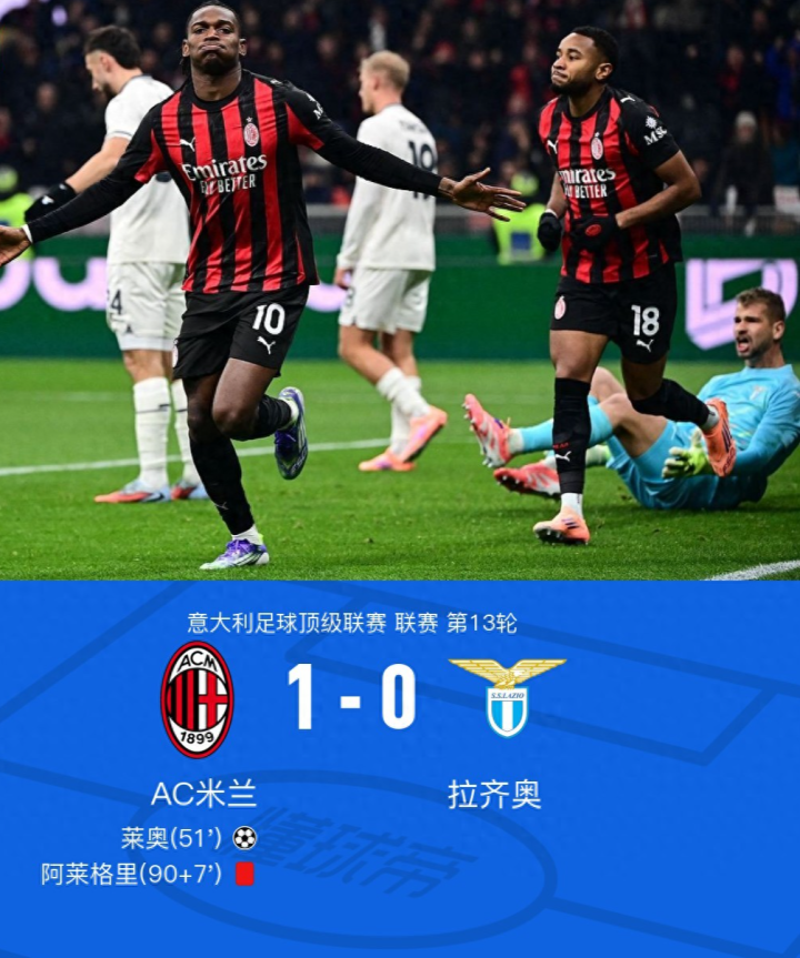 北京时间11月30日,意大利足球顶级联赛第13轮,AC米兰坐镇主场迎战拉齐奥。上半场,迈尼昂做出神扑。下半场,托莫里助攻,莱奥破门。比赛最后时刻,罗马尼奥利禁区内射门击中帕夫洛维奇手臂,主裁观看回放未给予点球判罚,阿莱格里不满判罚被红牌罚下。全场比赛结束,米兰1-0击败拉齐奥,在先赛的情况下暂时登上意甲榜首。